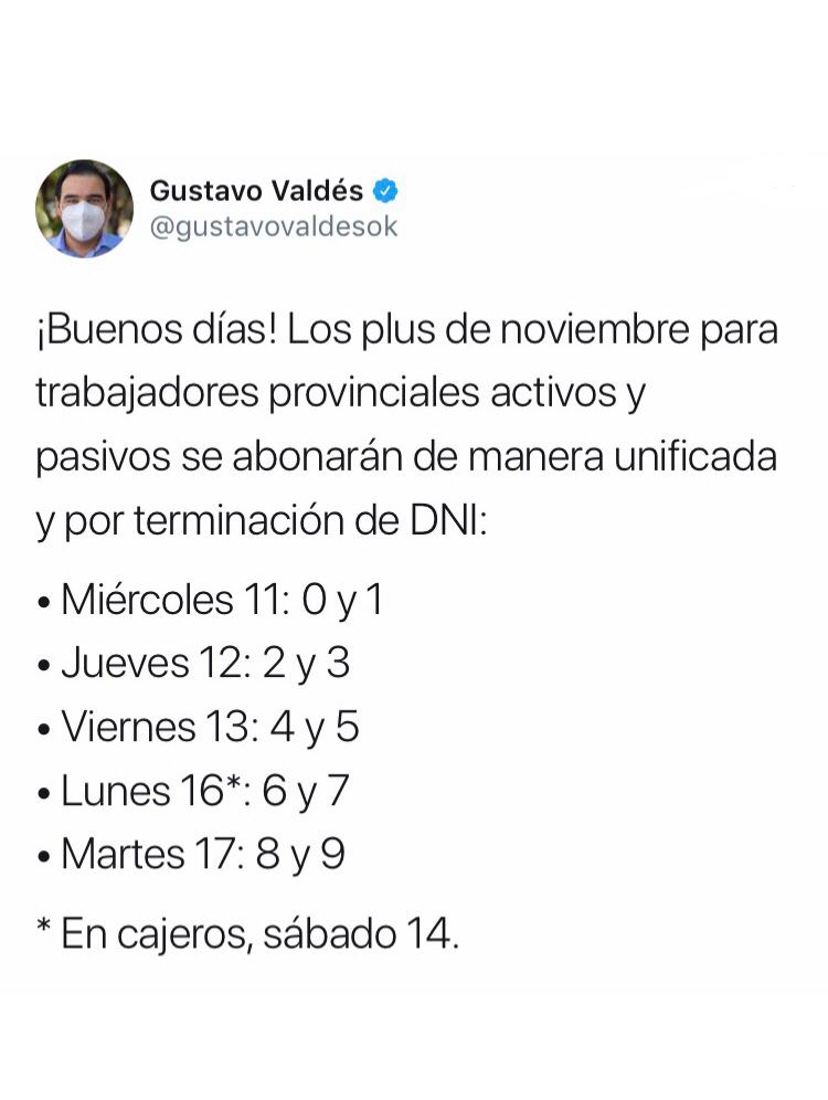 El gobernador Gustavo Valdés informó el pago de los plus de noviembre para trabajadores provinciales activos y pasivos, los cuales se abonarán de manera unificada y por terminación de DNI.