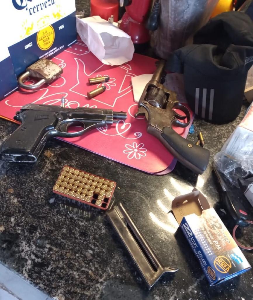 En estos momentos personal policial de investigaciones de la Dirección de Seguridad Metropolitana, están diligenciando una orden de allanamiento en un inmueble del Barrio Santa Rita, hay cuatro personas mayores masculinos demorados, además hallaron gran cantidad de marihuana (50 panes estimativamente) y Cocaína (un kilo y medio aproximadamente) y tres armas de fuego, dos revólveres y una pistola y cartuchos varios, balanza y elementos de corte.