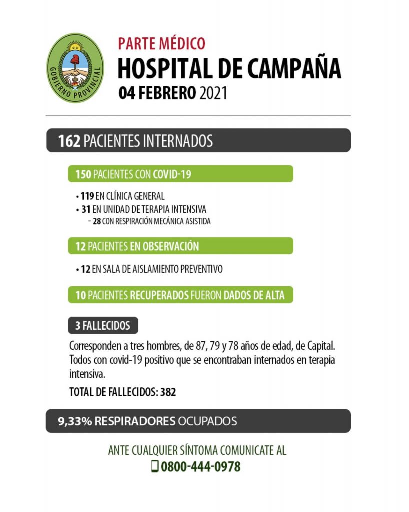 El Ministerio de Salud Pública informó este jueves el parte médico del Hospital de Campaña Escuela Hogar, dando cuenta de la recuperación de 10 pacientes que recibieron el alta, mientras que fallecieron 3 personas con resultado positivo para Covid-19.