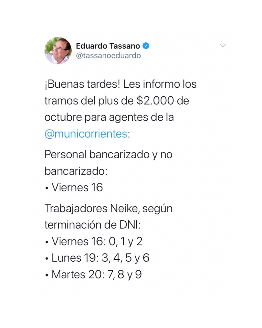 La Municipalidad de Corrientes efectivizará desde este viernes 16 el pago del plus de 2.000 pesos para todo el personal (trabajadores Neike, contratados y planta permanente). El anuncio fue dado a conocer por el intendente Eduardo Tassano a través de su cuenta oficial de Twitter.