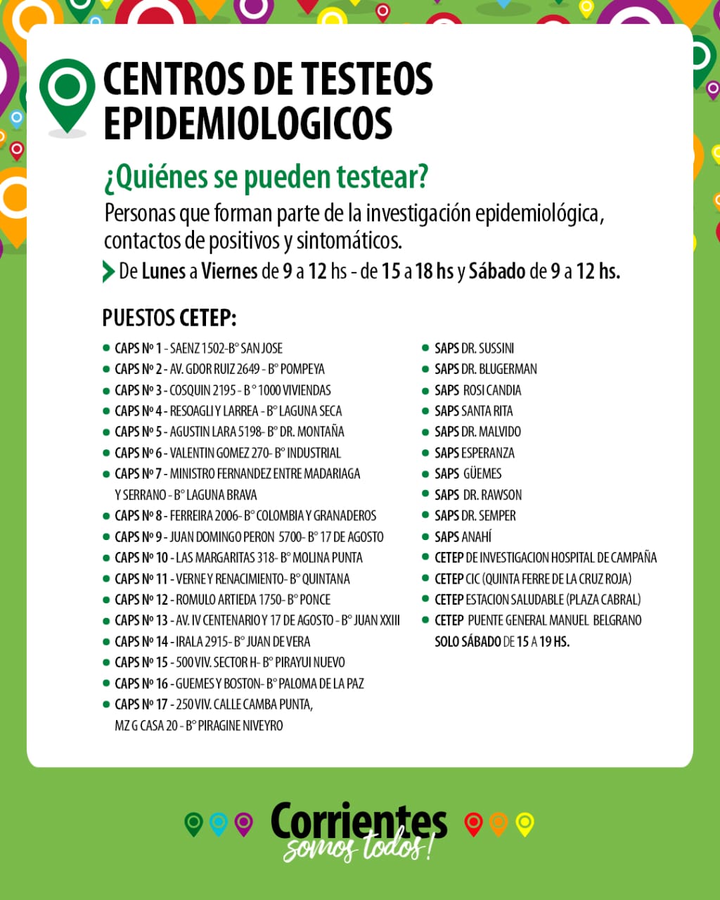 Los Centros de Testeos de Epidemiologia (CETEP) están ubicados en los 17 CAPS, en 10 SAPS, en el Hospital de Campaña, en el CIC Quinta Ferré de la Cruz Roja y en el puente General Manuel Belgrano, de lunes a viernes de 9 a 12 y de 15 a 18, y sábados de 09 a 12.