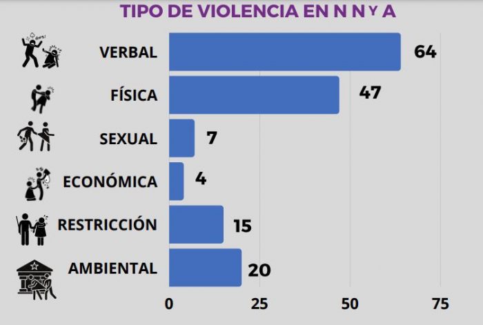 En el caso del 4% registrado contra Niñas, Niños y Adolescentes, en 64 ocasiones fueron violencia verbal; 47 veces, física; 7 veces, sexual; 4 veces, económica; 15 veces, restricción; y 20 veces, ambiental.