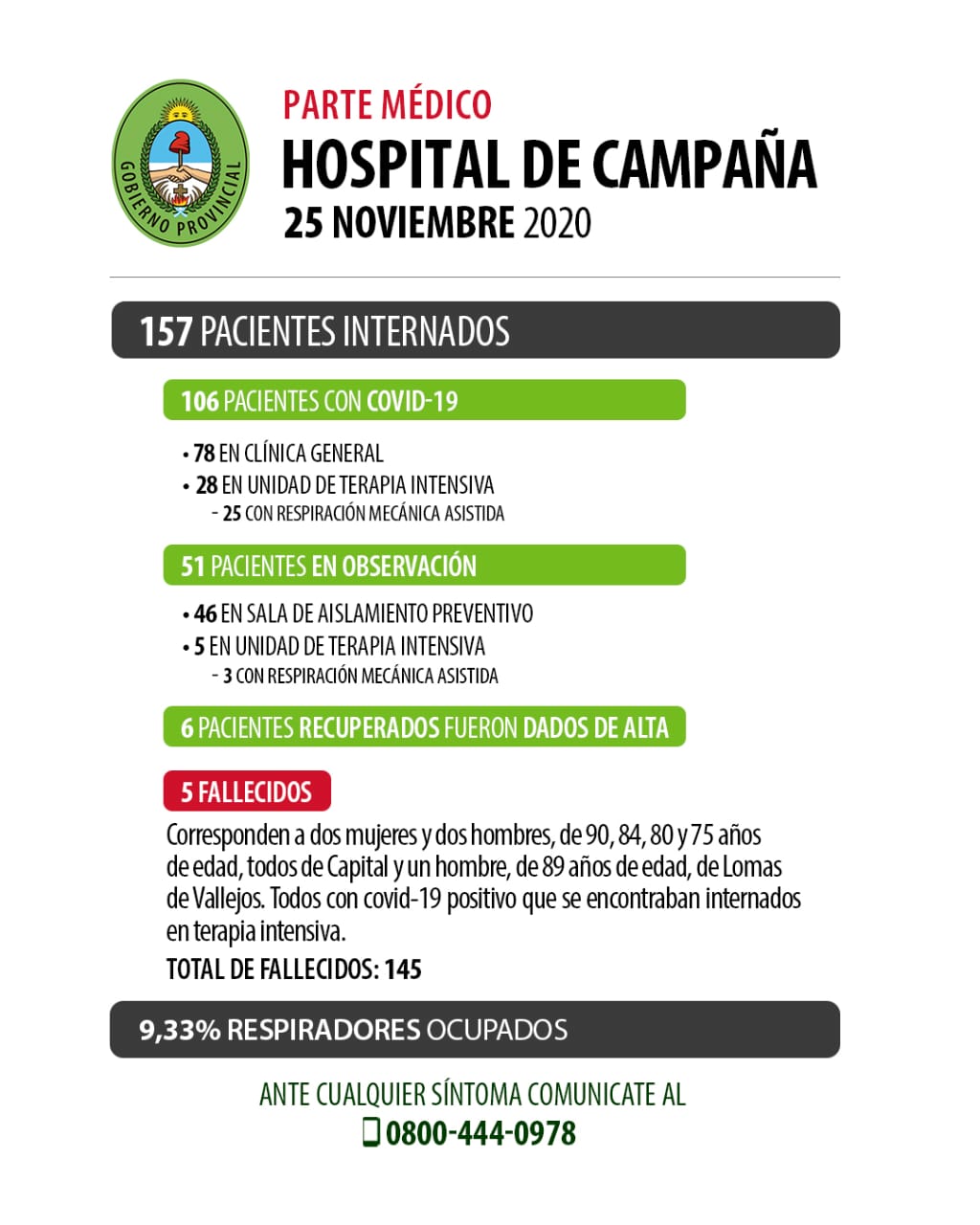 En tanto, el informe emitido desde la Dirección Ejecutiva del Hospital de Campaña Escuela Hogar detalla además que a la fecha (25 de noviembre), se encuentran internados 157 pacientes, de los cuales 106 tienen diagnóstico de Covid-19 y 51 con sospecha de Covid-19.