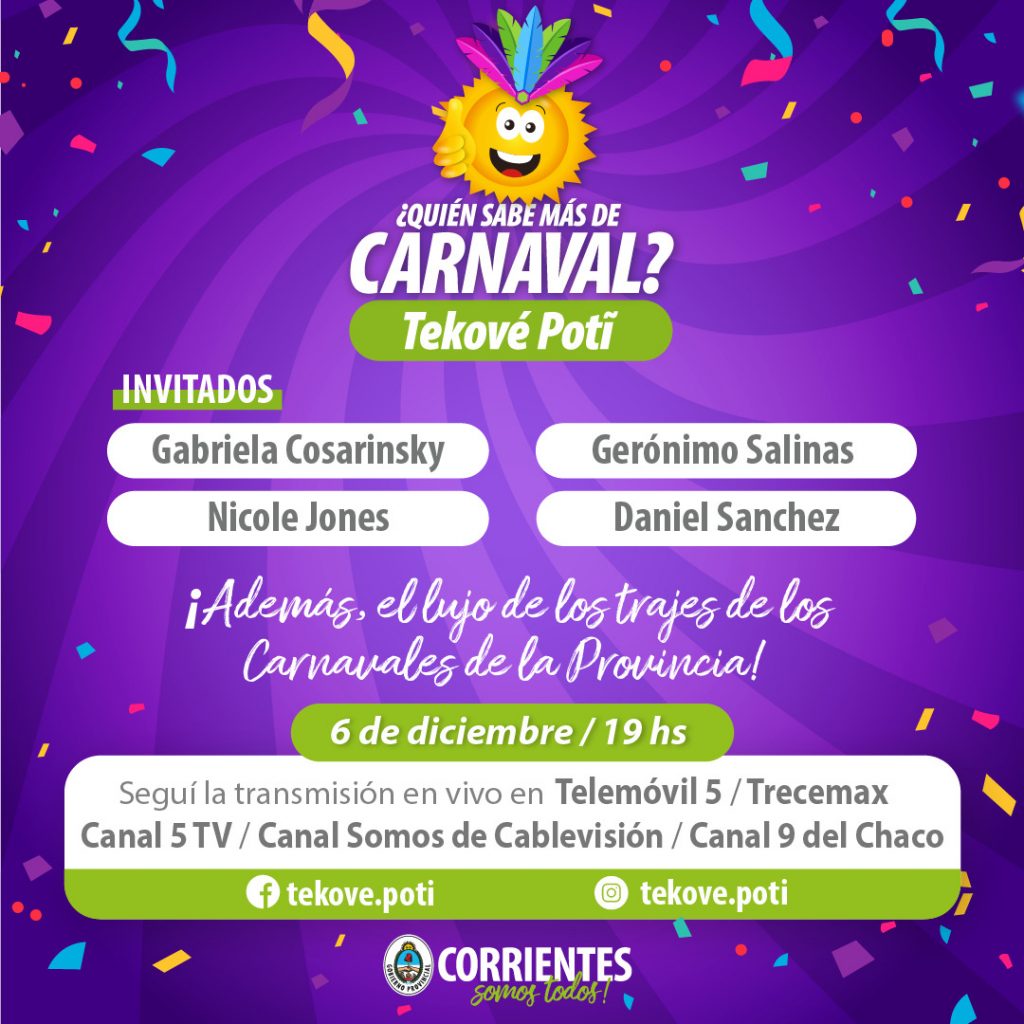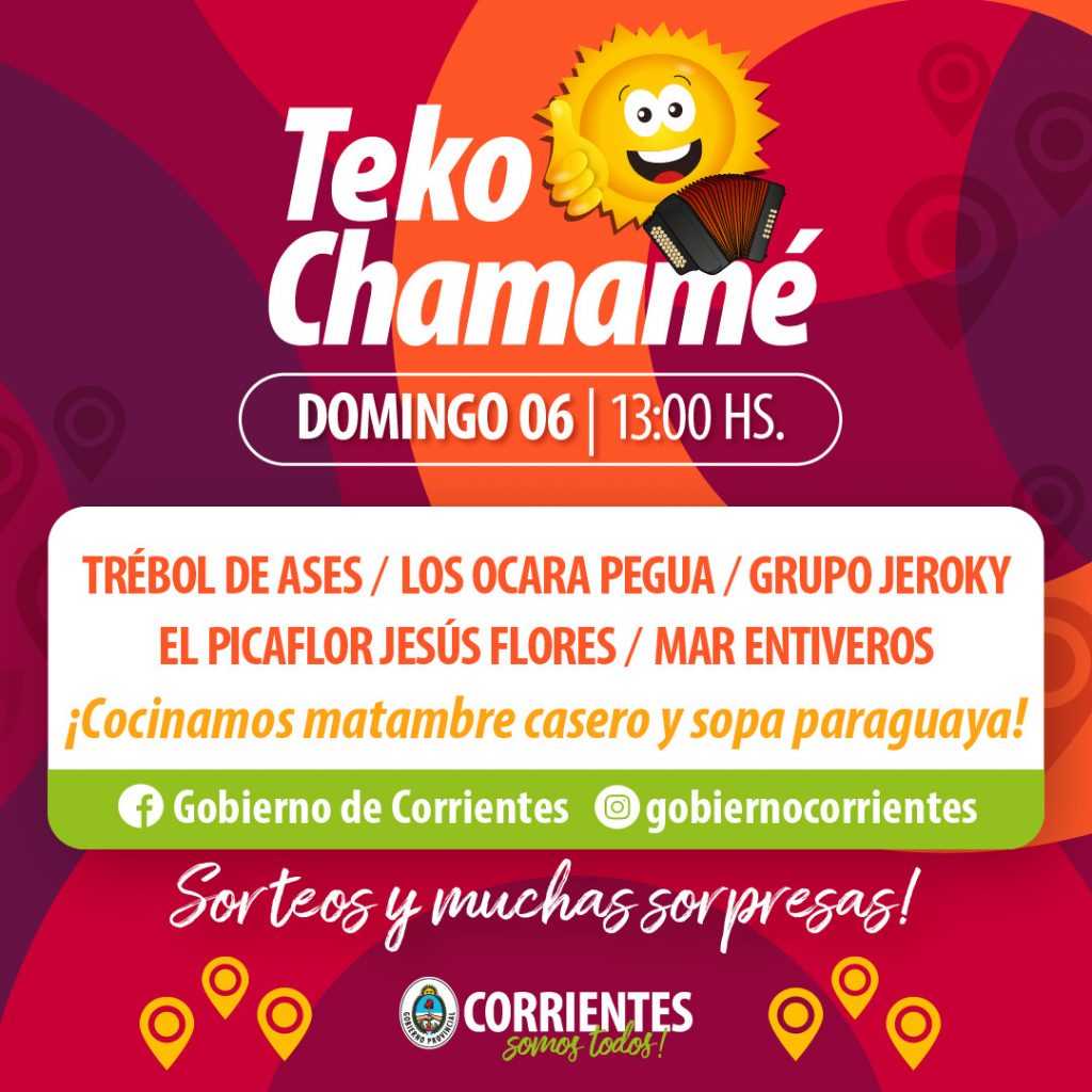 Durante este fin de semana, Corrientes Cumbia Virtual, Teko Chamamé y ¿Quién sabe más de Carnaval? volverán a visitar el hogar y las plataformas de los correntinos, junto a la mejor de nuestra música y con importantes premios. Seguí cada uno de los shows a través de las redes Facebook: Gobierno de Corrientes; Instagram: @gobiernocorrientes, @ctescumbia y @tekochamame; Youtube: TekoChamame Virtual y Ctes Cumbia Virtual y 13 Max.