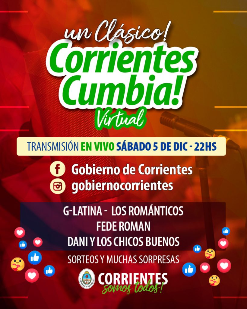 Después, y para arrancar con música tropical como cada sábado el “Corrientes Cumbia virtual” contará con la presencia, a partir de las 22, de G- Latina, Los Románticos, Fede Román y Dani y los chicos buenos. Además de los sorteos y sorpresas para quienes sigan las transmisiones en vivo.