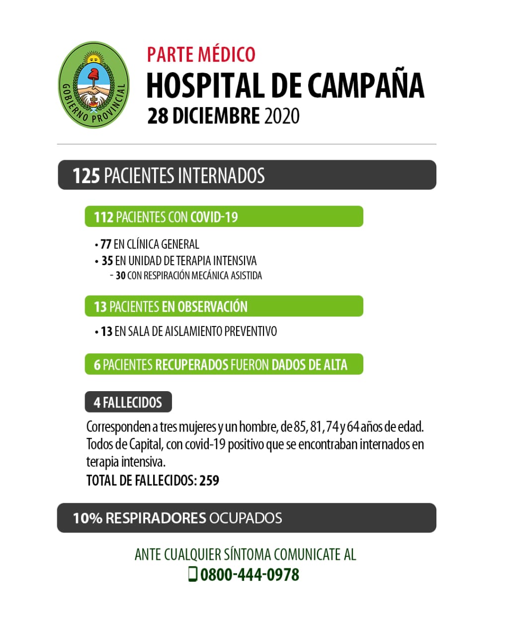 El informe emitido desde la Dirección Ejecutiva de la institución detalla que a la fecha (28 de diciembre), se encuentran internados 125 pacientes, de los cuales 112 tienen diagnóstico de Covid-19 y 13 sospecha de Covid-19.