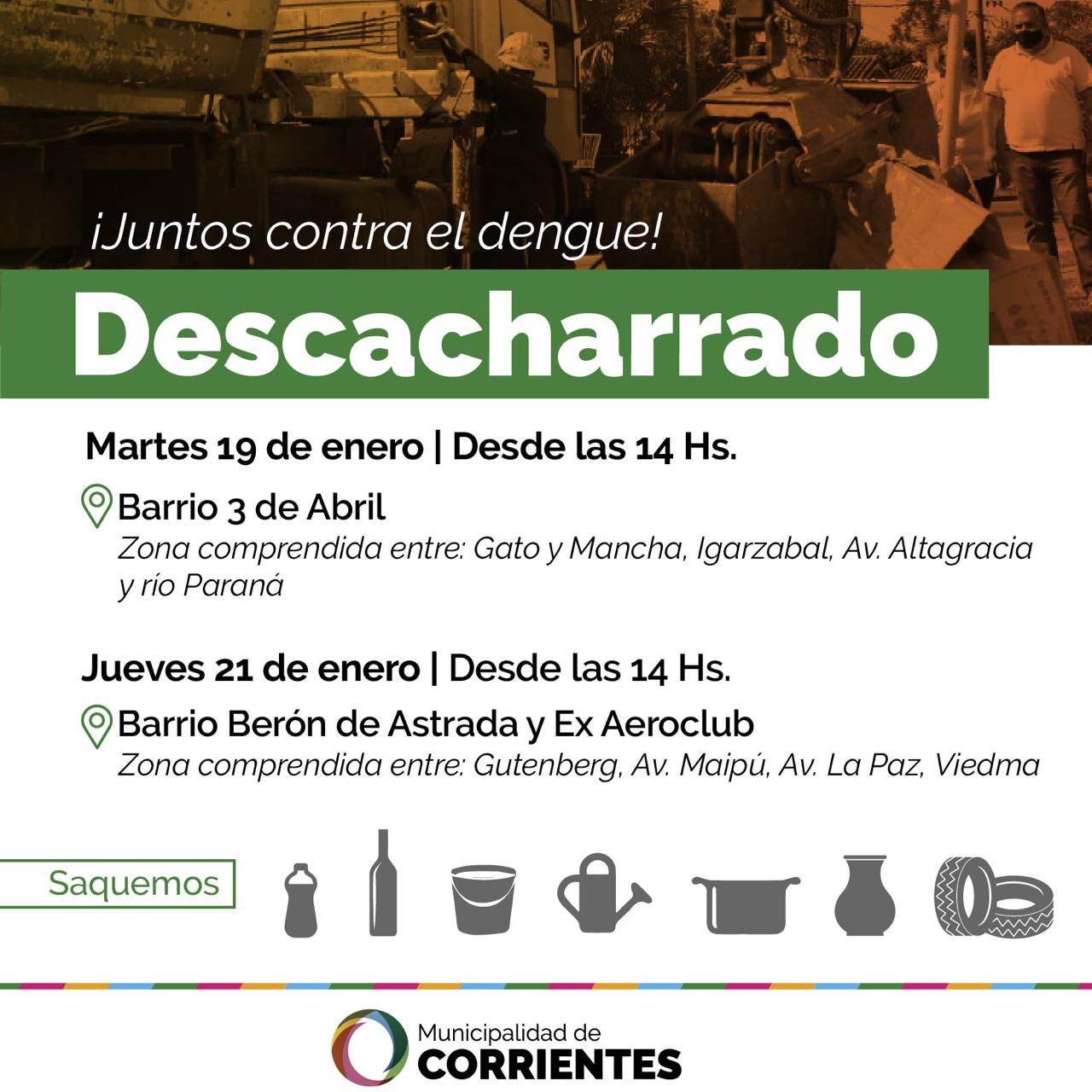 En el marco del plan de lucha contra el dengue que lleva adelante la Municipalidad de Corrientes y el Gobierno de la Provincia, el martes y jueves se realizará un nuevo operativo de descacharrado en los barrios 3 de Abril, Berón de Astrada y Ex Aeroclub, respectivamente.