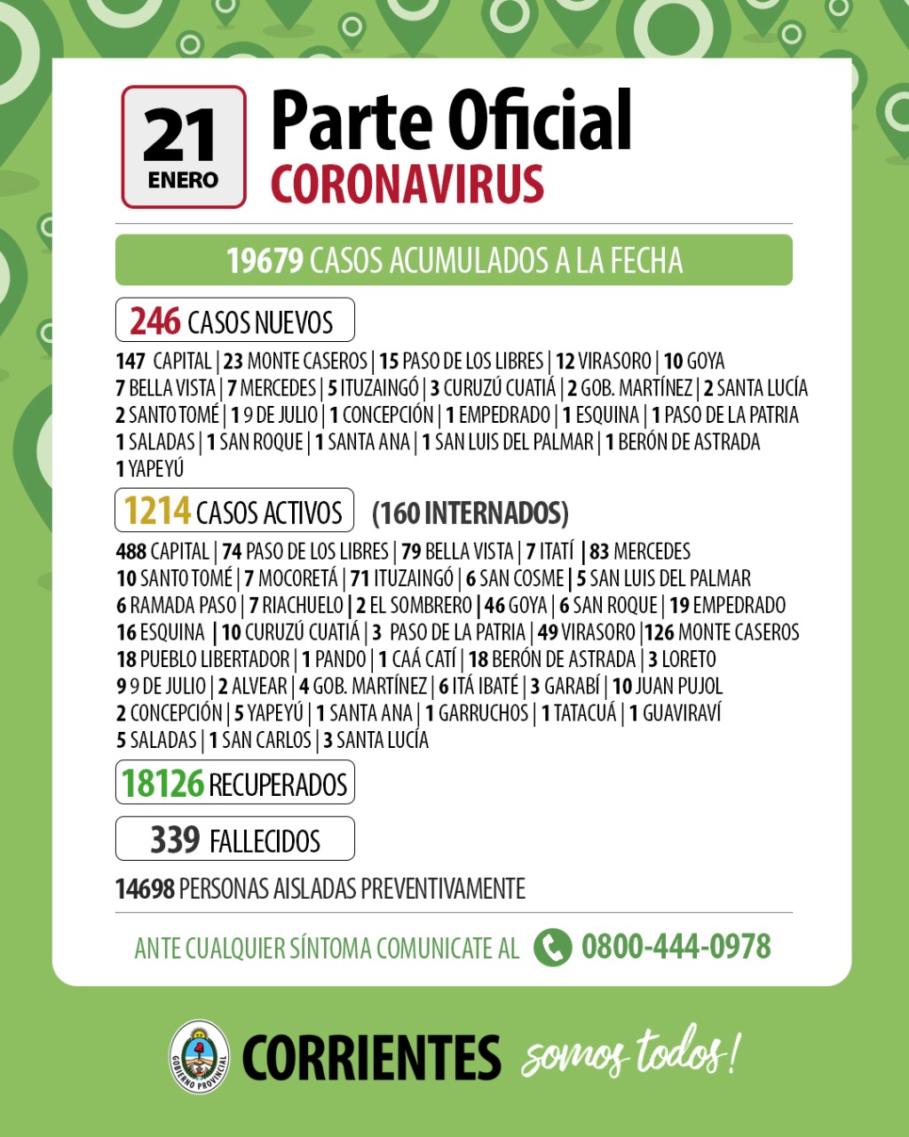 Es así que a la fecha se acumulan 19.679 casos, de los cuales 246 son nuevos, quedando 1.214 activos, 160 internados, 18.126 recuperados, 339 fallecidos y 14.698 personas están aisladas preventivamente.