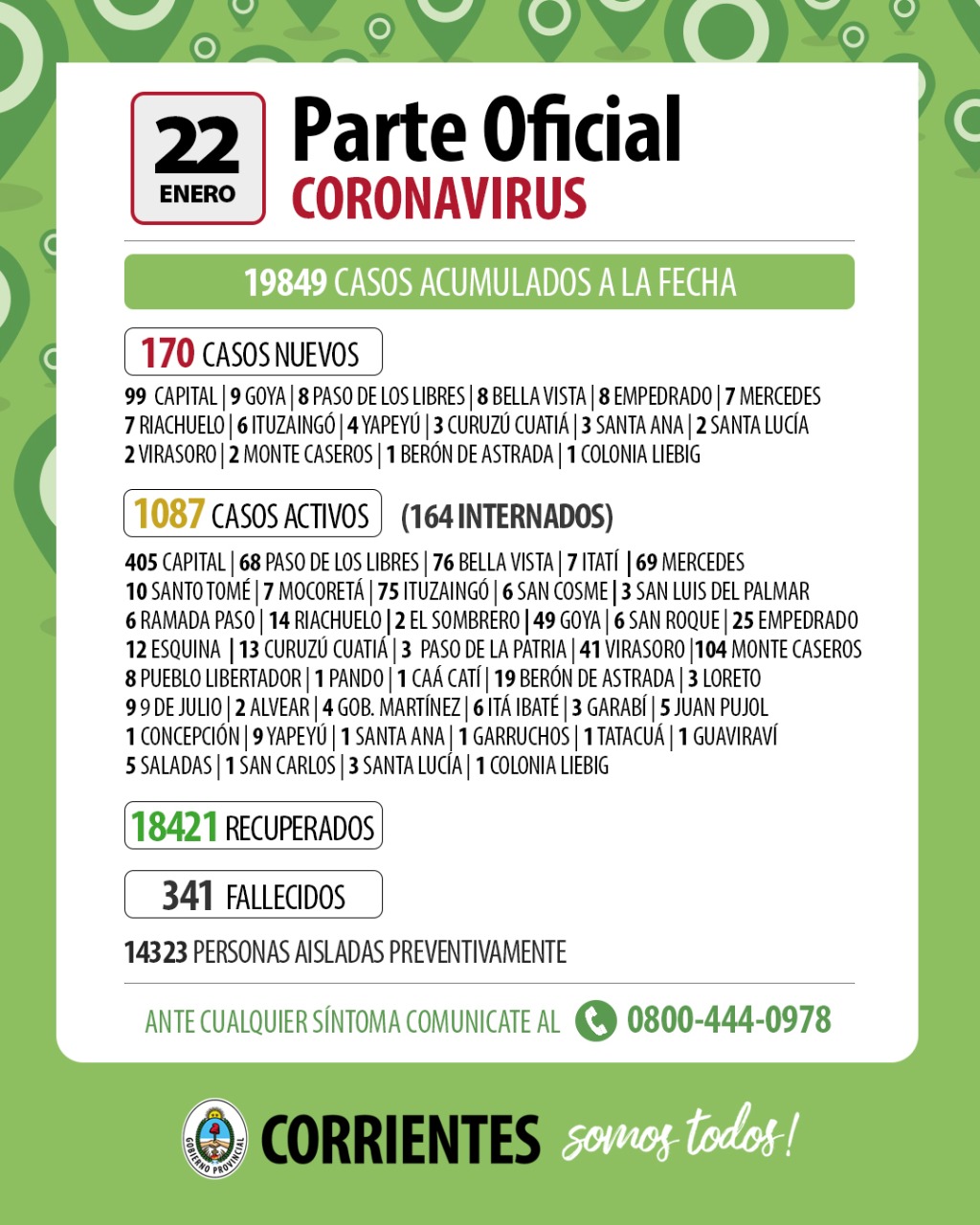 Los nuevos casos se distribuyen de la siguiente manera: Capital 99, 9 Goya, 8 Paso de los Libres, 8 Bella Vista, 8 Empedrado, 7 Mercedes, 7 Riachuelo, 6 Ituzaingó, 3 Curuzú Cuatiá, 3 Santa Ana, 2 Santa Lucía, 4 Yapeyú, 2 Virasoro, 2 Monte Caseros, 1 Berón de Astrada, 1 Colonia Liebig.