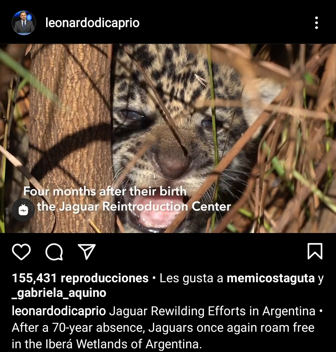 El video dura un minuto y está acompañado por una descripción en comentarios del actor, afirmando que “después de una ausencia de 70 años, los jaguares vuelven a deambular libremente por los humedales del Iberá en Argentina.”