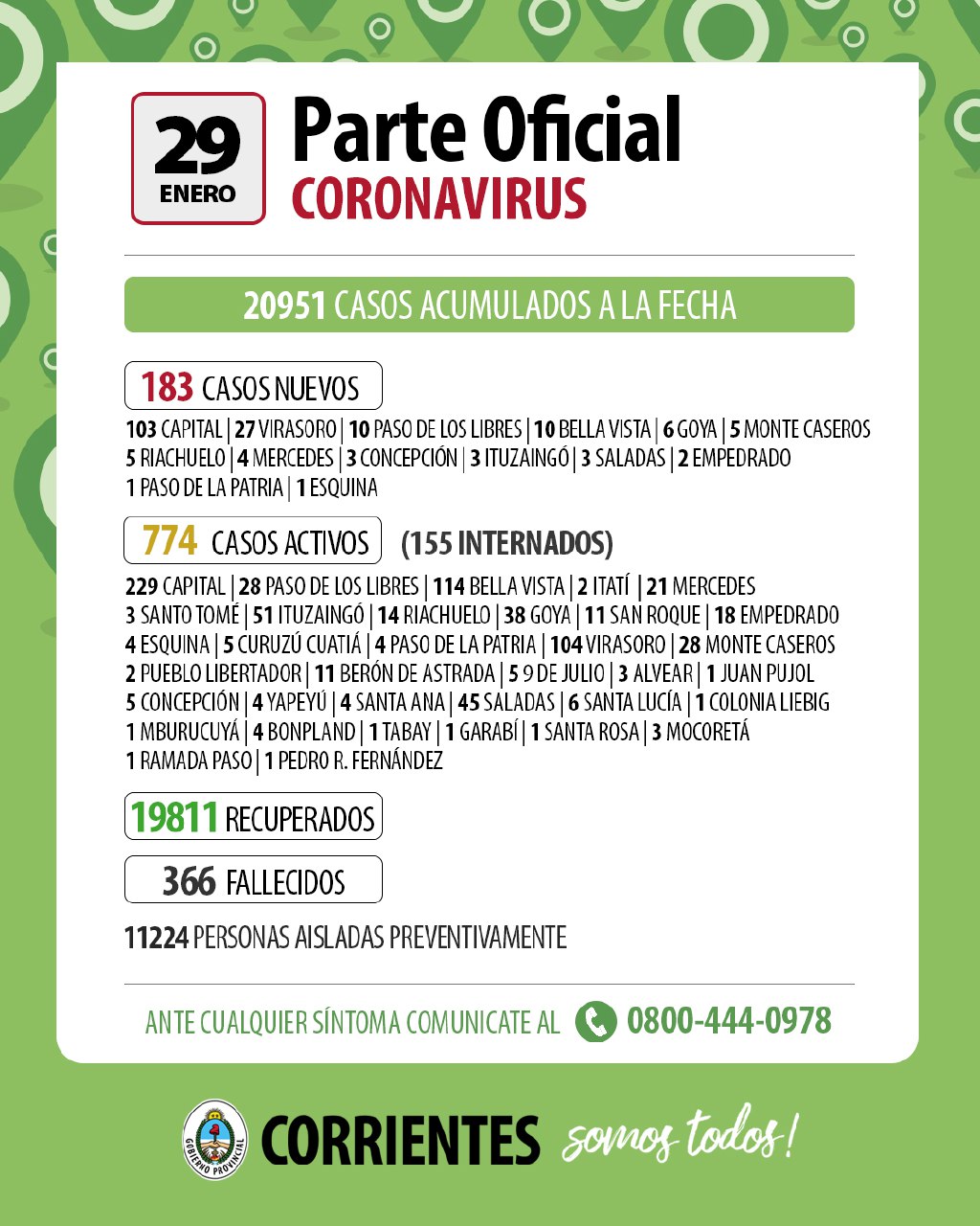 El informe epidemiológico de la provincia de Corrientes registró este viernes 29 de enero 183 nuevos casos positivos de Covid-19, de los cuales 103 corresponden a Capital y los 80 restantes se distribuyen en 13 localidades del interior. En tanto, los casos activos se actualizan a la fecha en 774 y los acumulados en 20.951, permaneciendo internadas 155 personas en el Hospital de Campaña y 11.224 aisladas preventivamente en sus respectivos hogares.