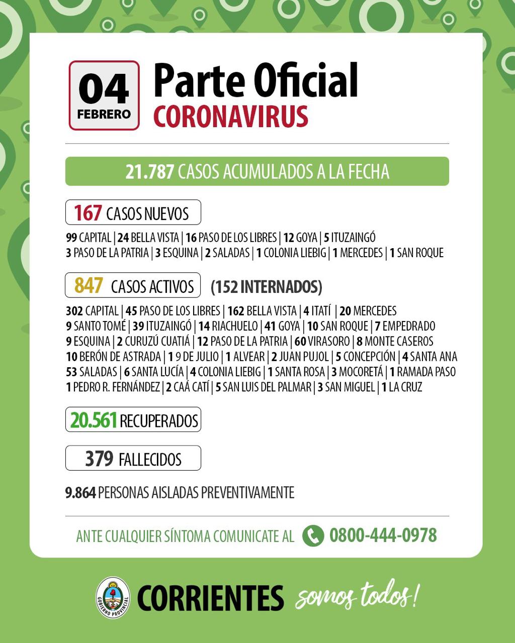El informe epidemiológico de la provincia de Corrientes registró este jueves 167 nuevos casos positivos de Coronavirus, de los cuales 99 fueron contagios en la ciudad Capital y los 68 restantes en diez localidades del interior provincial. Esto actualiza la cifra de casos activos en 847 y los acumulados en 21.787 en todo el territorio provincial al 4 de febrero de 2021, mientras que son 379 los fallecidos y 152 los internados en el Hospital de Campaña, con 20.561 recuperados y 9864 personas aisladas preventivamente en sus respectivos hogares.