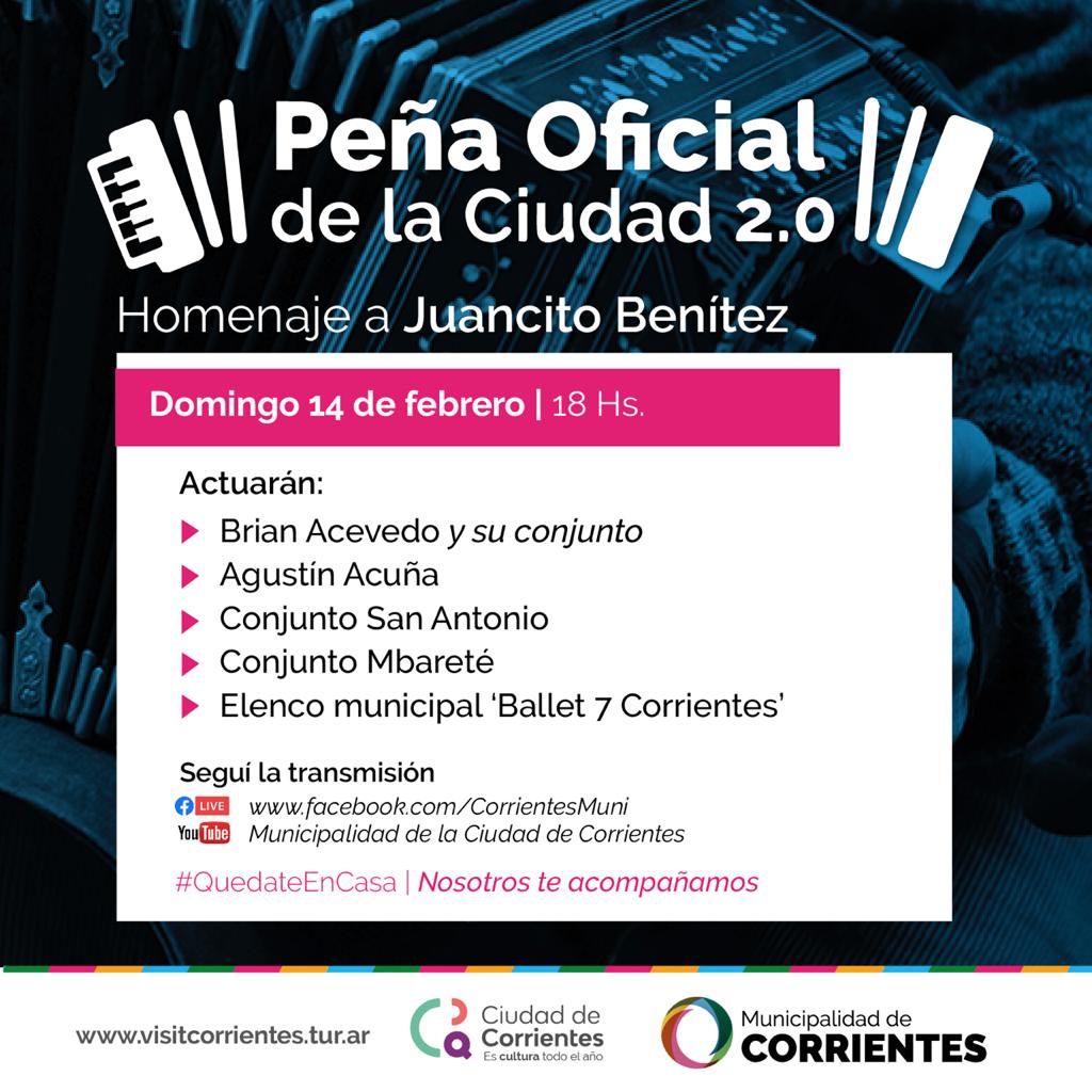 La Municipalidad de Corrientes prepara una nueva presentación de la Peña de la Ciudad 2.0, propuesta cultura gratuita que busca acercar una variada oferta musical chamamecera a través de las redes sociales, adaptándose de esta manera a los tiempos de pandemia por el coronavirus.
