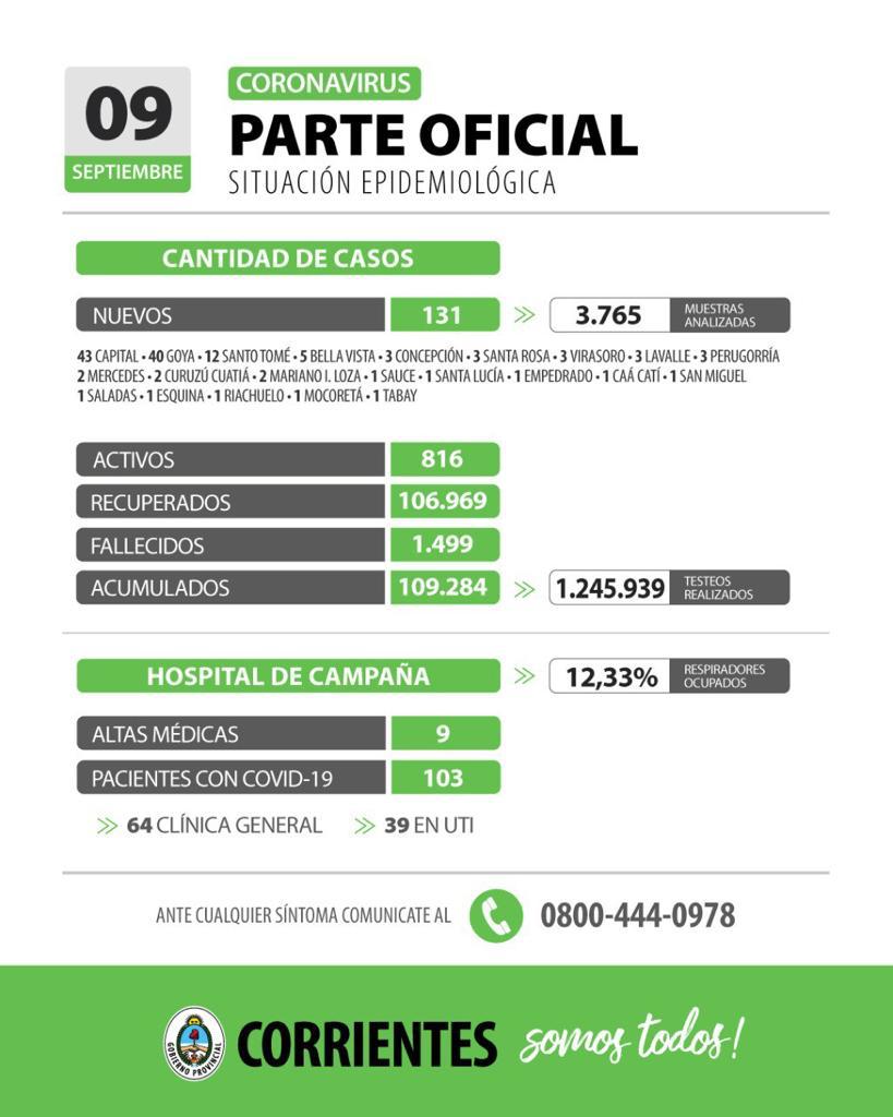 Esto actualiza la cifra de casos activos en 816 y los acumulados en 109.284 en todo el territorio provincial al 9 de septiembre de 2021, con 1.245.939 testeos realizados desde que inició la pandemia y 106.969 recuperados.