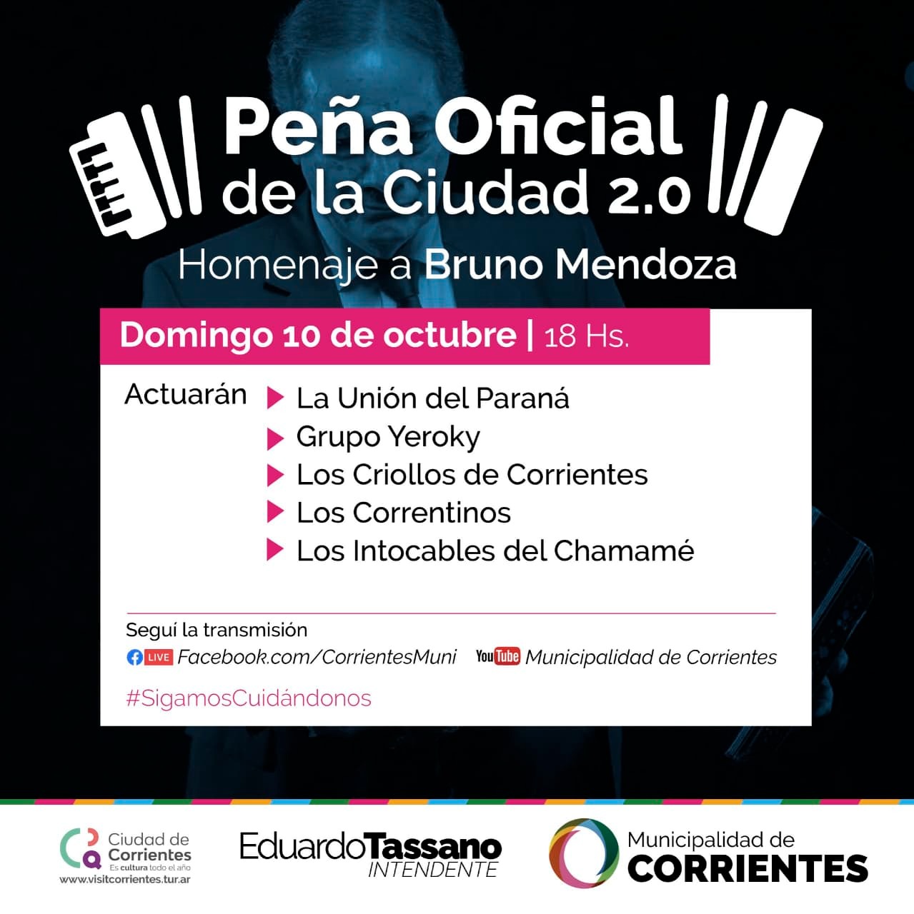 Como cada domingo desde las 18, a través de las redes sociales de la Municipalidad de Corrientes, se realizará una nueva edición de la Peña Oficial de la Ciudad 2.0. En esta oportunidad, se realizará un homenaje al destacado músico Bruno Mendoza, además de las actuaciones de destacados músicos de la música litoraleña.